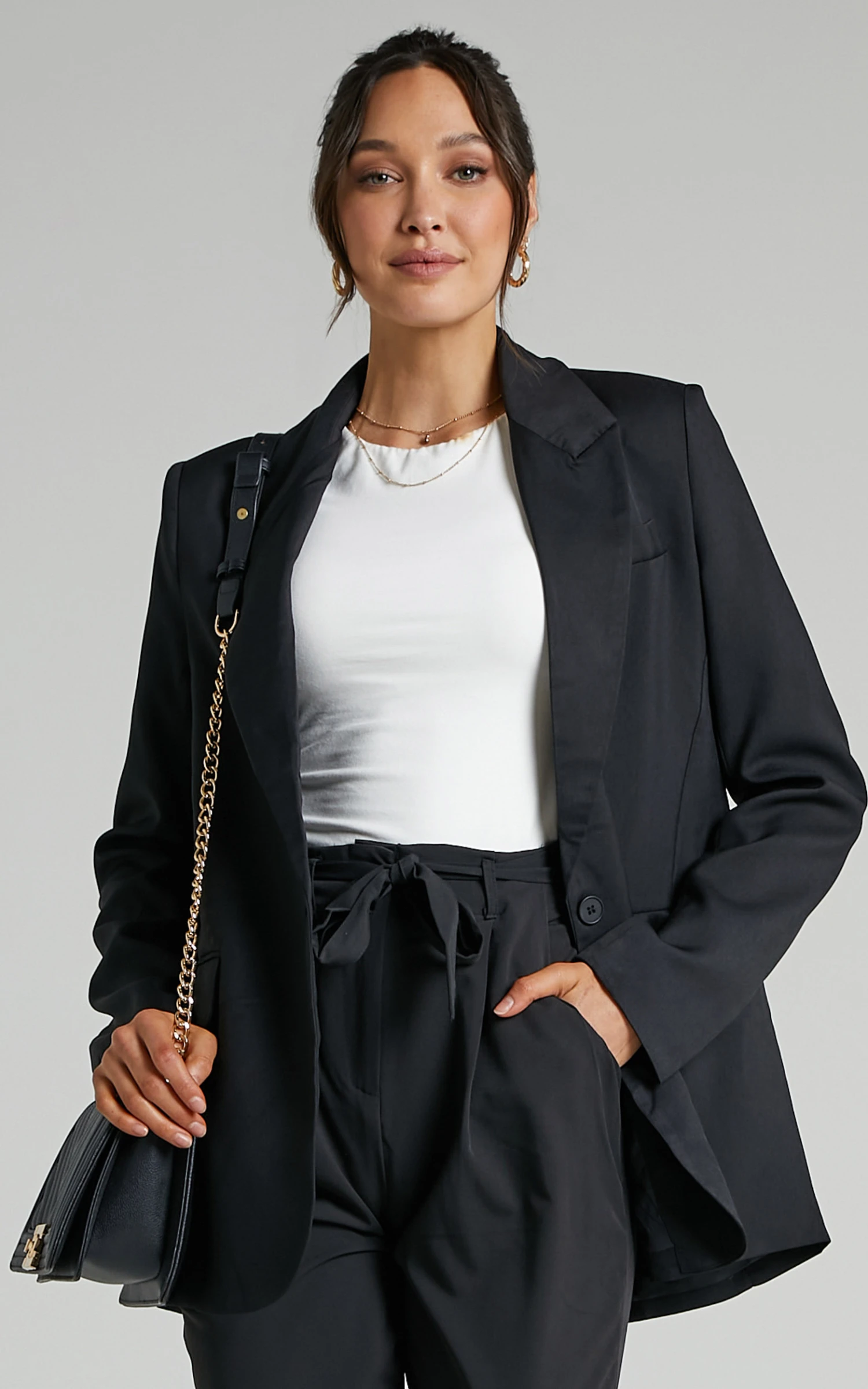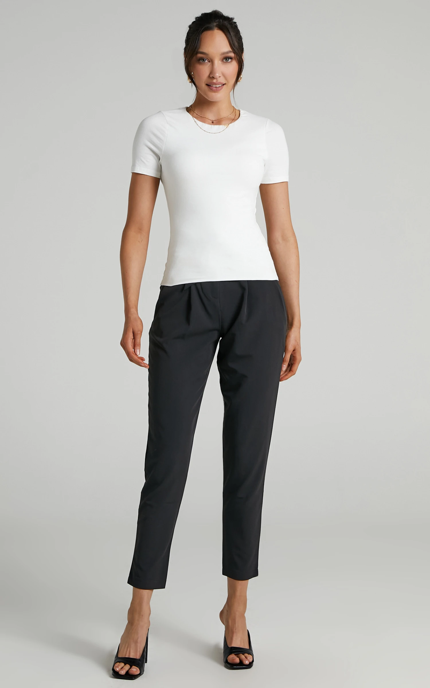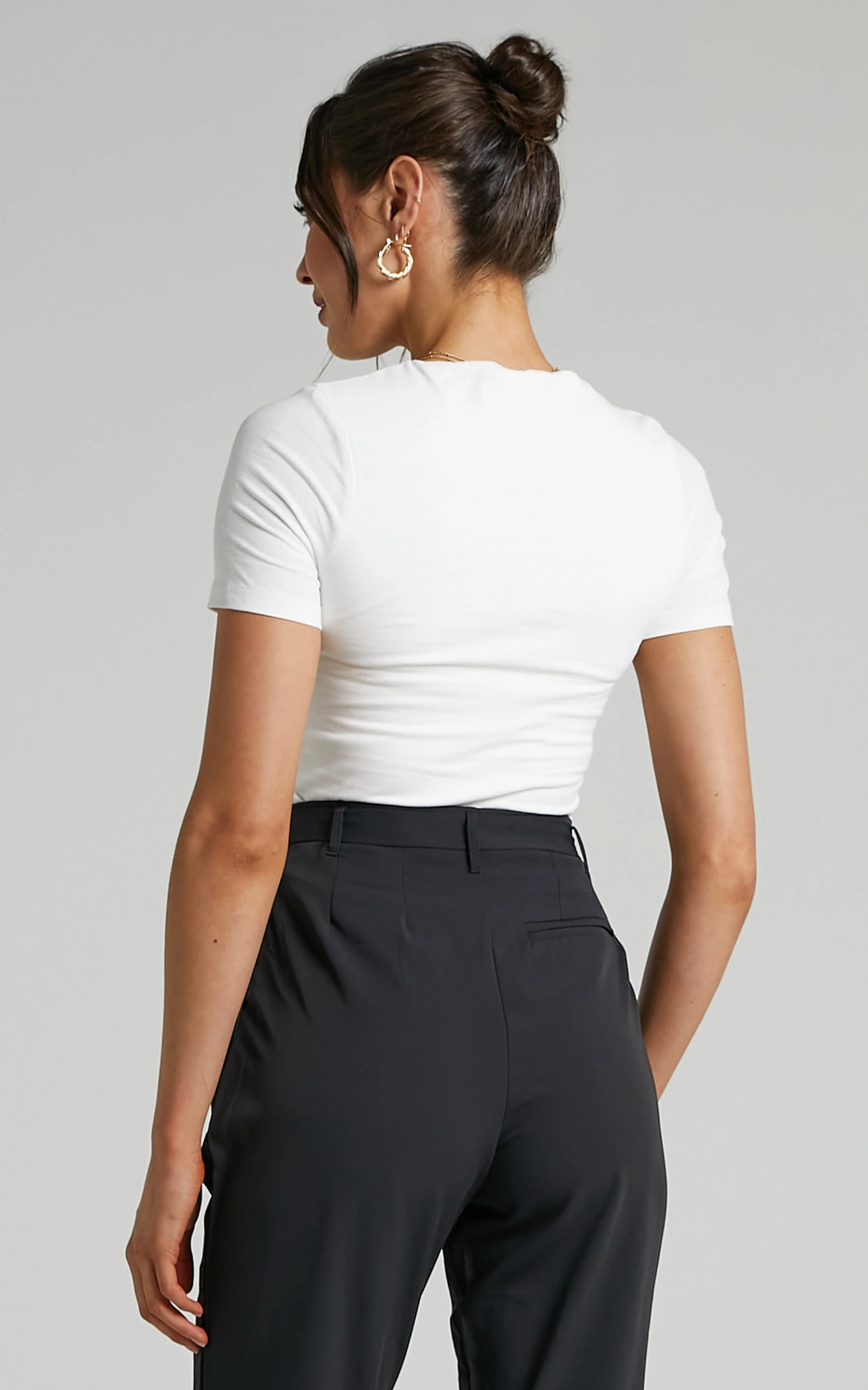 Create a simple but cute work look by tucking this one into the Lorcan High Waisted Tailored Pants in Charcoal and adding heels to match!