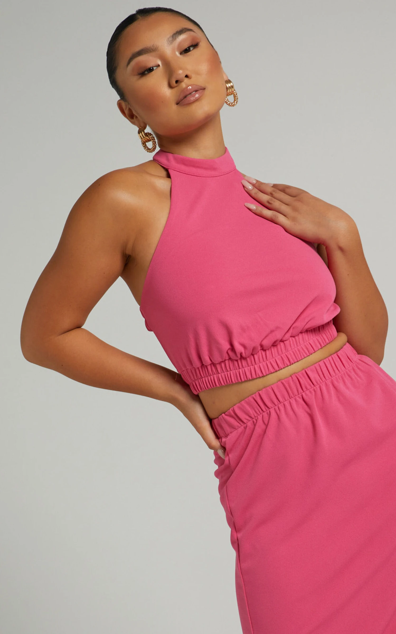 Give your staple tops an update with our Kiki Top! This chic and versatile number will be your new go-to for casual events or dressy occasions. It features a high halter neckline with a stand collar, an open back, elastic hem and a horizontal elastic strap at the back. It’s such an easy number to pop on and it can be styled in many ways. Team it with high waist shorts, strappy heels and a mini handbag for a casual chic day to night look!