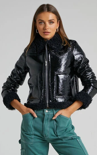 Dial up the fun with our Kobe PU Jacket! This stunning jacket serves up luxe texture with its shiny PU finish and faux shearling touches, including a large fluffy collar and matching trims at the hem and cuffs. It’s a bold piece that still feels super wearable thanks to its one-tone black palette and classic fit. Wear it to casual occasions through the cooler months paired with jeans, a tight-fitting top and your favourite boots.