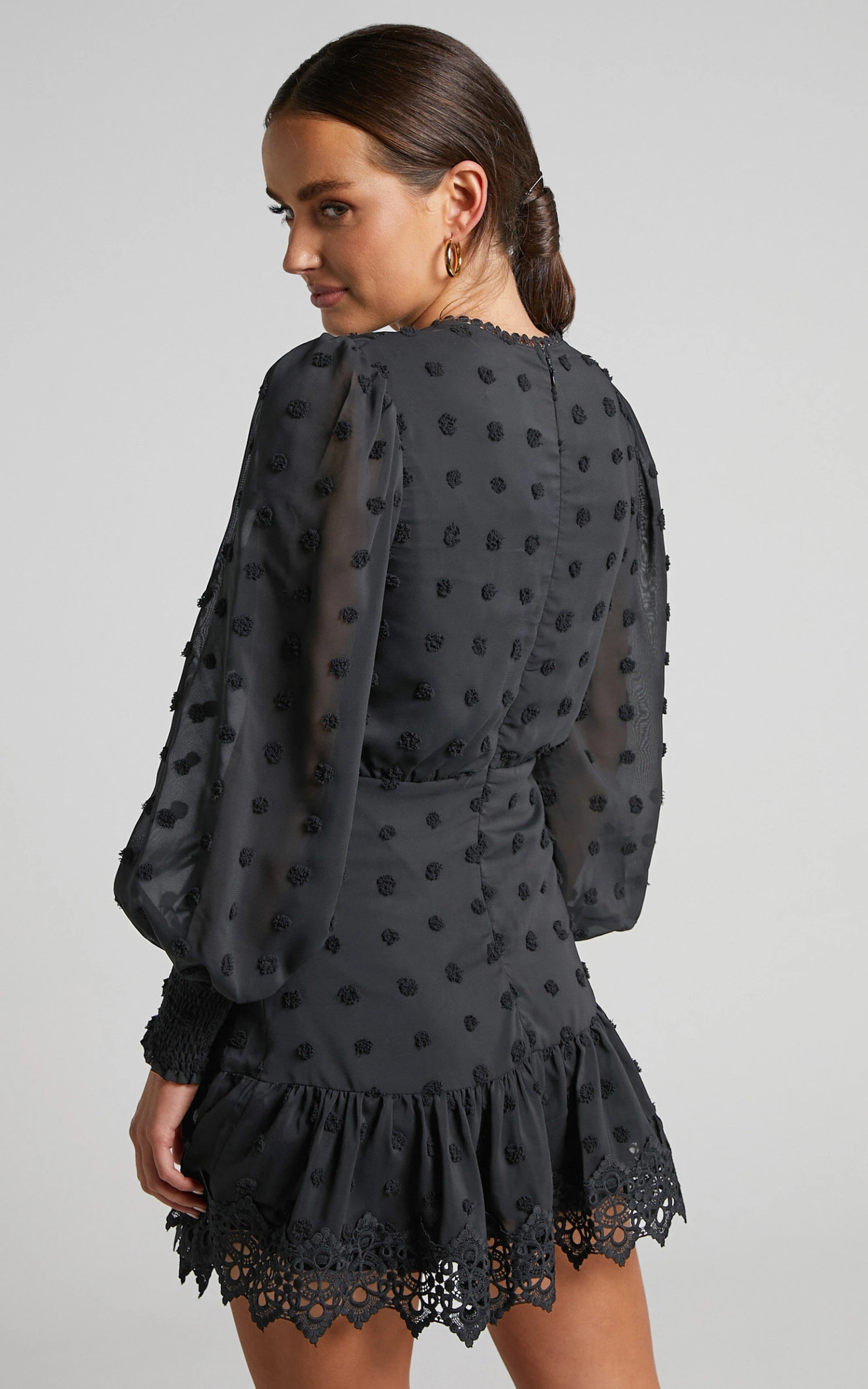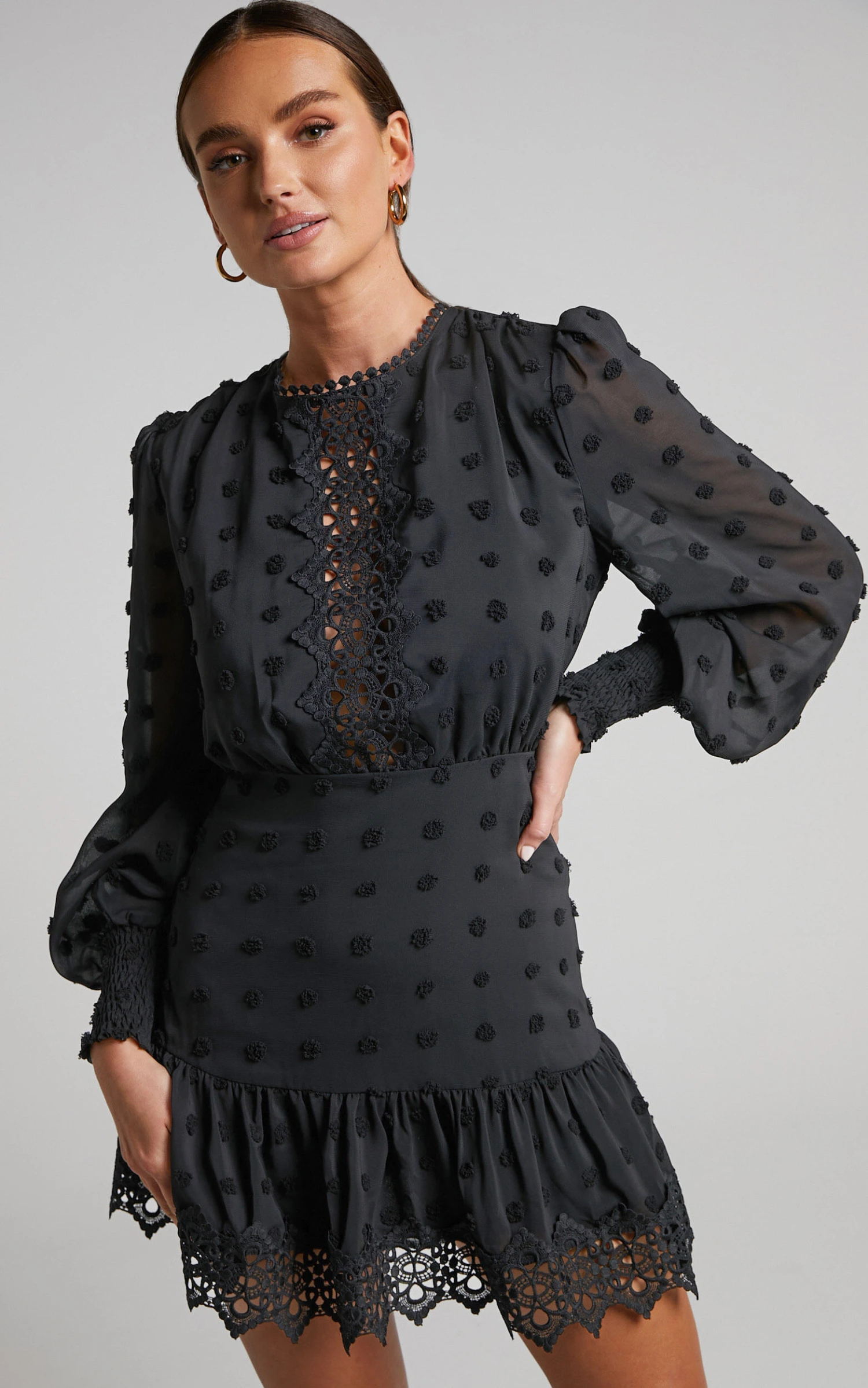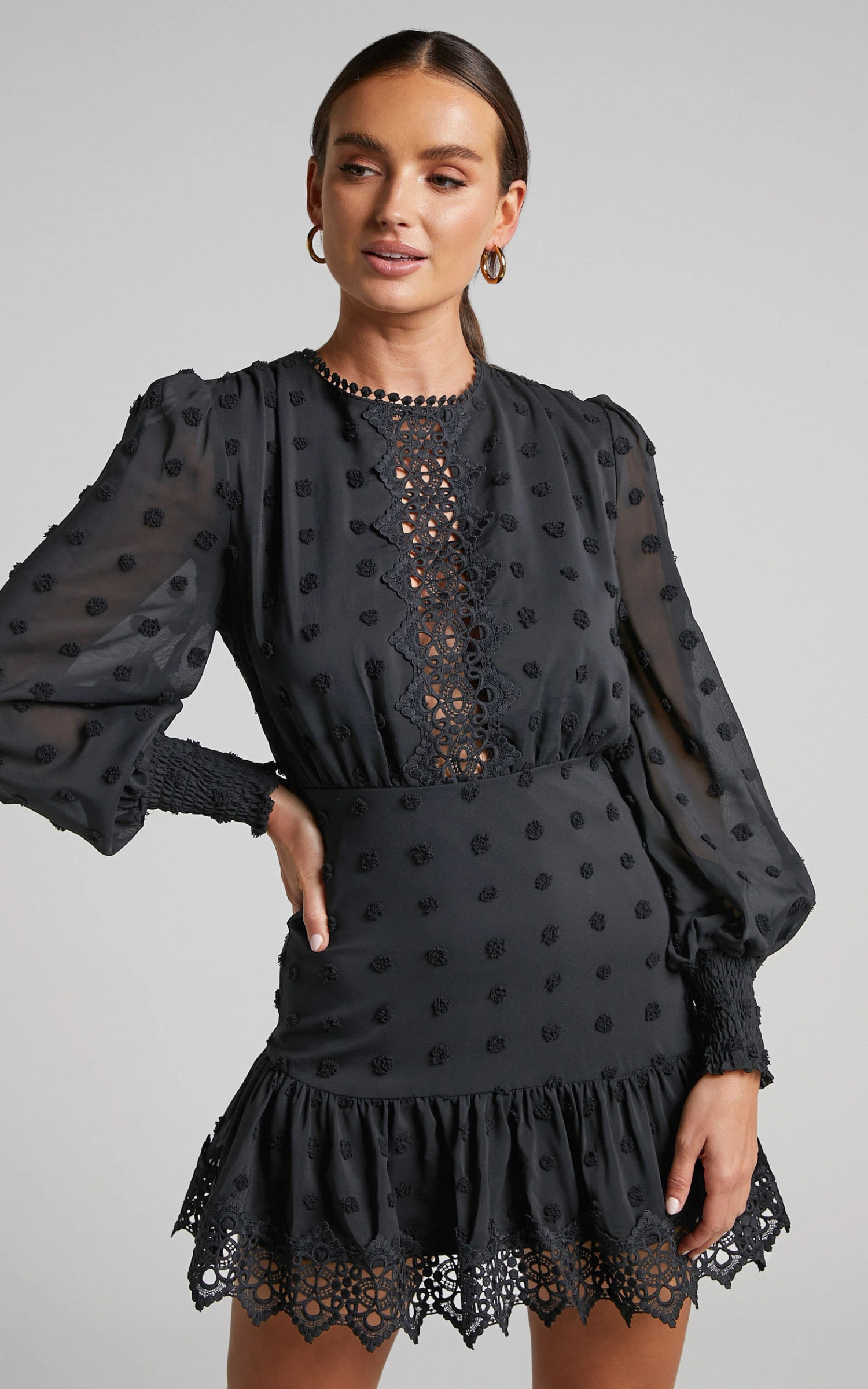 Incorporate chic textures into your wardrobe with the Meihna Dress! This pretty mini features a round neckline with circle trimming, laser cut lace panels on the centre front and hem, long bishop sleeves with shirred cuffs and a textured dobby detailing all over. It’s an incredibly gorgeous piece that was made for day parties and beyond. Just pair it with pretty drop earrings and high heels for a stunning ensemble!
