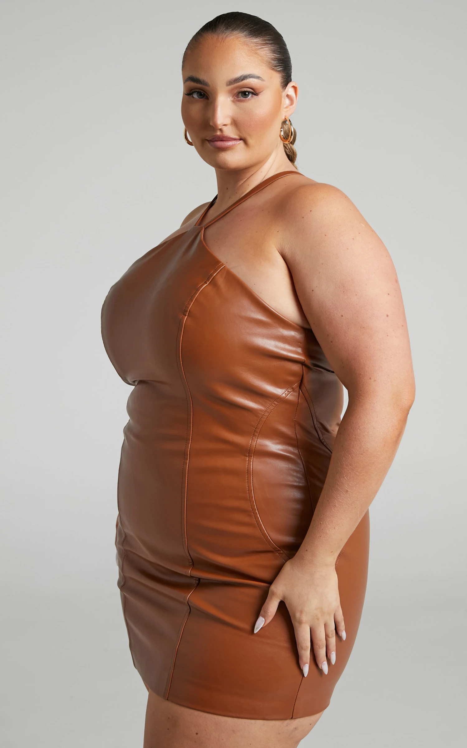 Highlight your best assets with our Minx Dress! This amazing mini fits like a glove and features a halter neck, panelled seams on the front and back, and a faux leather finish. It’s absolutely perfect for a night out with the girls. Wear it with some lace up stiletto heels, hoops and finish it off with a mini handbag for an insta-worthy look!