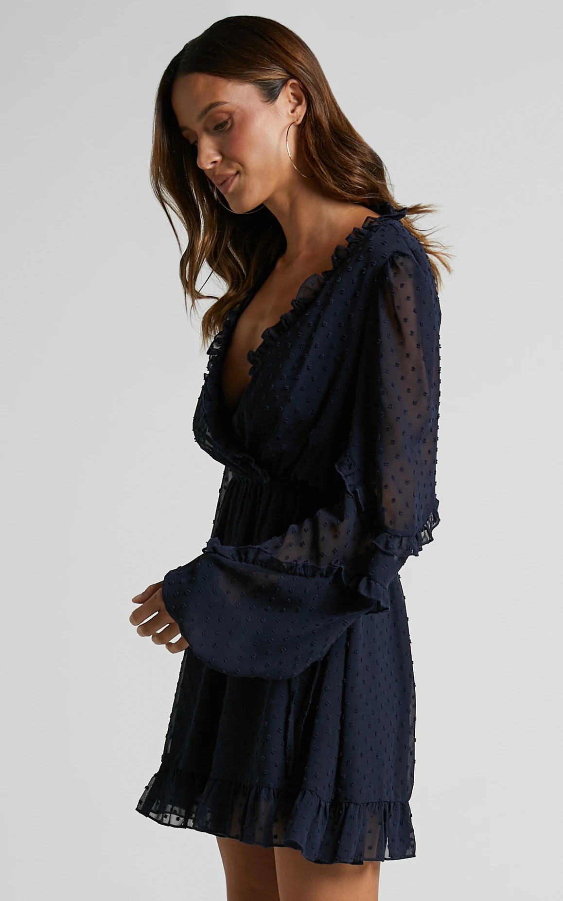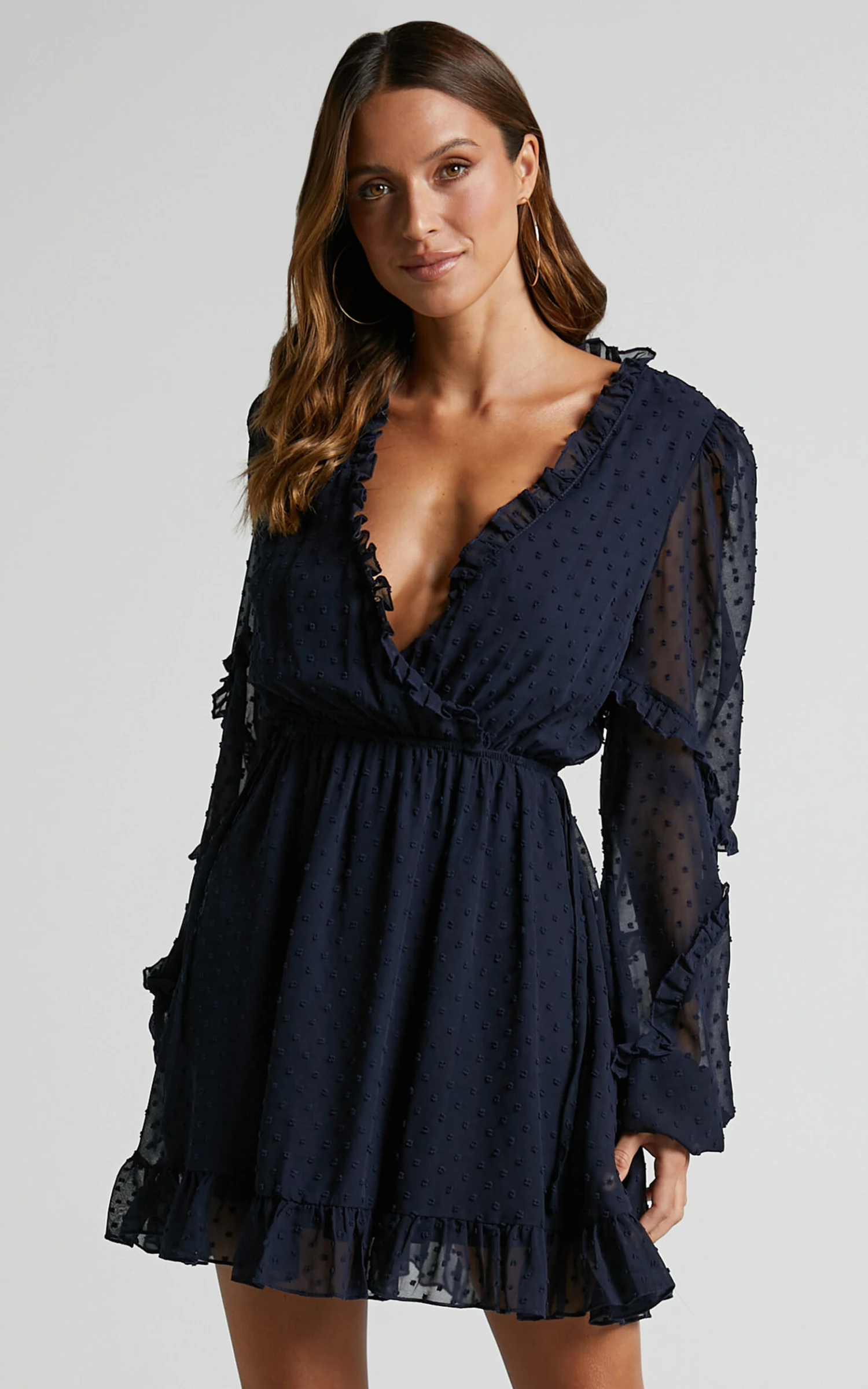 Step up your party game with the Sancha Long Sleeve Frill Mini Dress in Navy – a must-have for any fashion-forward wardrobe. This A Line dress features a flattering V-neckline and chic frill detailing, perfect for making a statement at any summer event. The classic navy shade adds versatility to this mini dress, allowing you to effortlessly mix and match accessories to switch up your look.