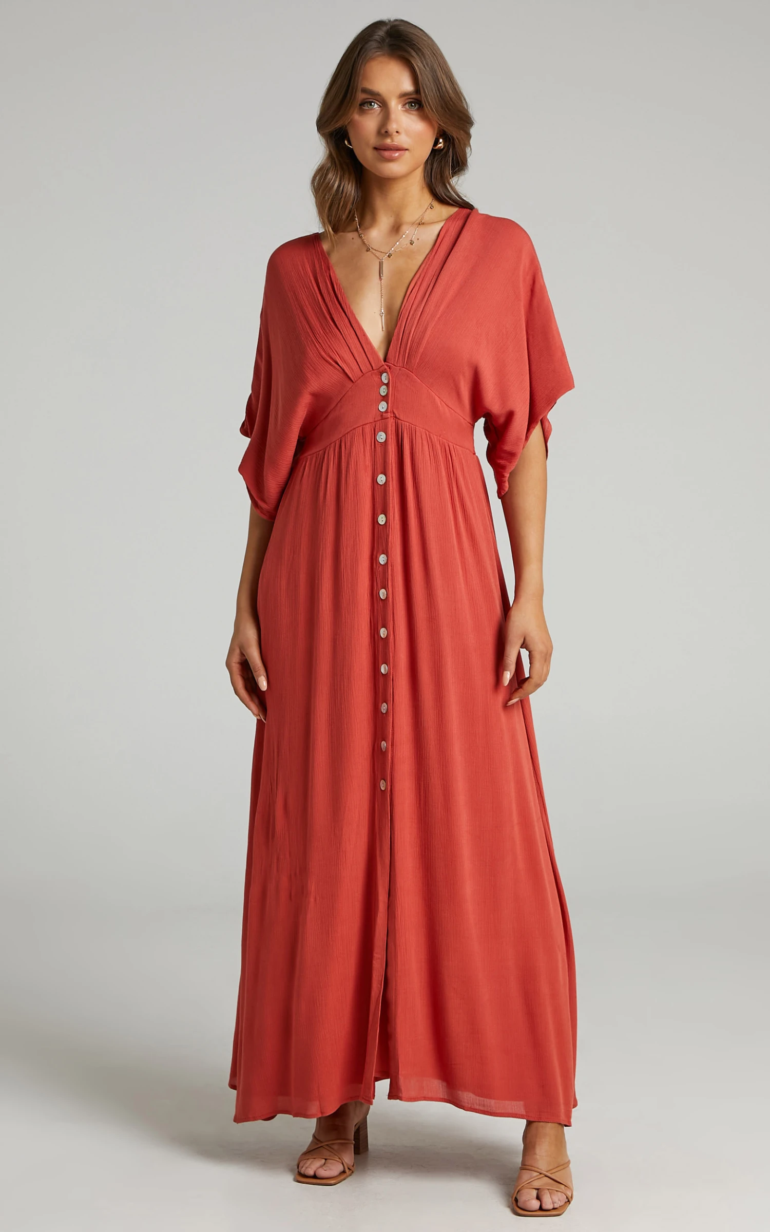 Our Sitting Pretty Dress is so dreamy! It’s your new go-to maxi for casual hangs and daytime events in the warmer months. Featuring a plunging neckline, buttons down the front and elastic shirring at the back, it’s such a comfortable and versatile piece. Slip it on for the beach with sandals and a shoulder bag or dress it up for the bar with glam heels and jewellery!