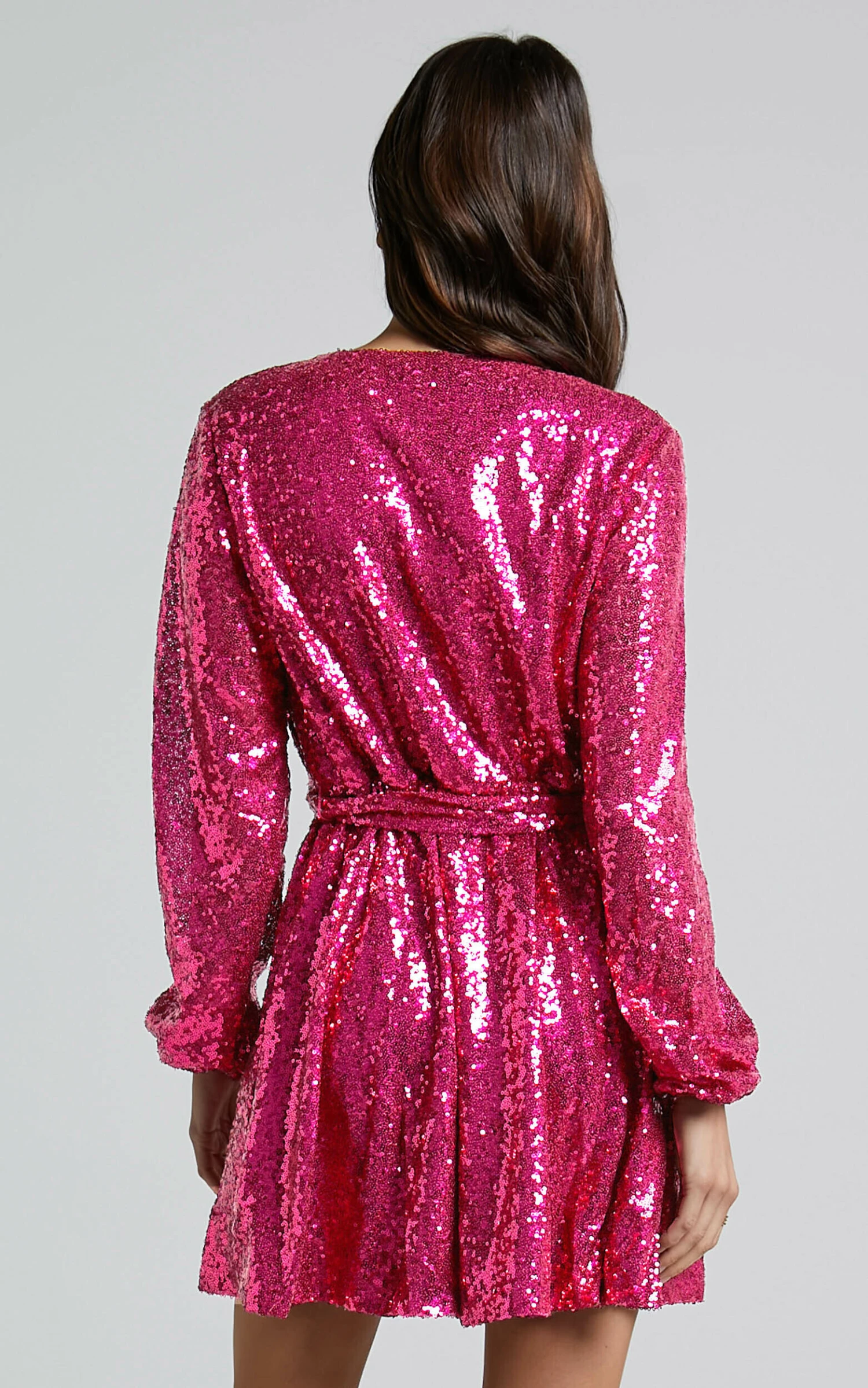 Stand out from the crowd in the Three Of Us Dress! This gorgeous sequin mini features a plunging neckline, long sleeves and an elasticated waist with a tie detail. Glamorous and relaxed, it’s a piece you’ll never want to take off! Pair it with your favourite heels and jewellery for a hot party look!