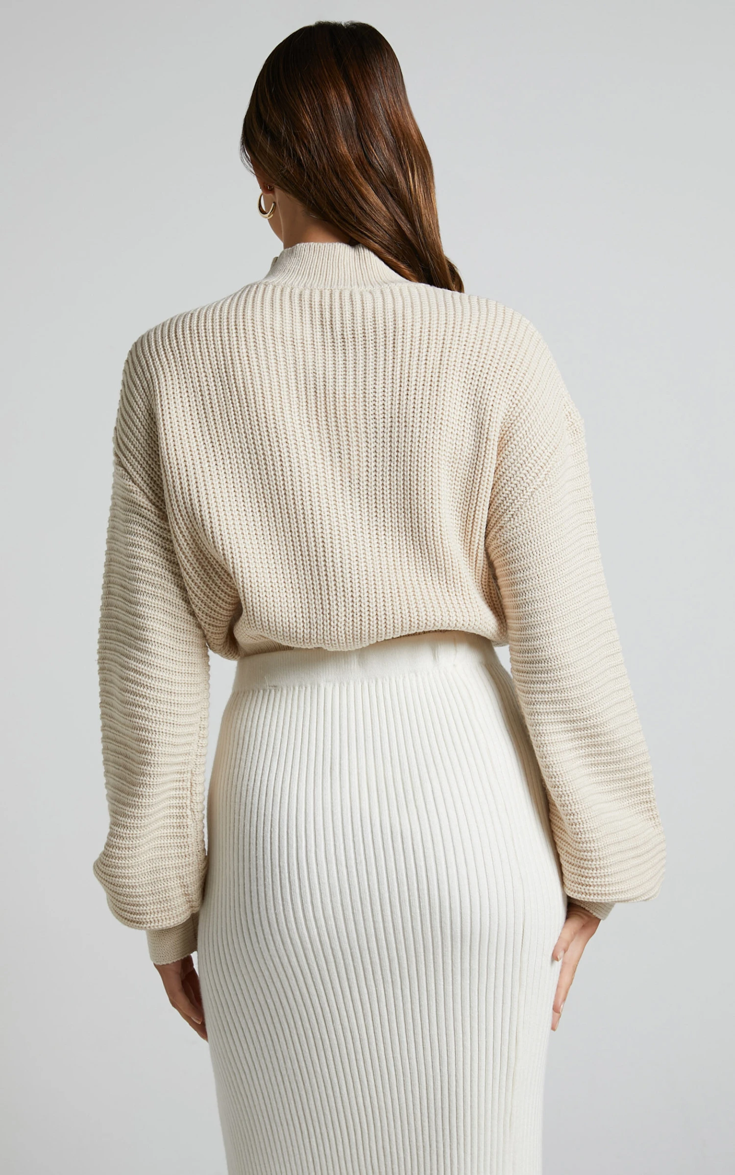Give the autumn-winter season a warm welcome in our Valerie Jumper! This mid weight knit features a ribbed high neckline, long balloon sleeves with cinched cuffs and a wide ribbed hem. It’s easy to throw on and perfect for the cooler seasons. Pop it on with some denim jeans, heeled boots and a mini handbag for a chic day to night look!
