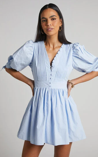 Showpo Zandra Puff Sleeve Poplin Mini Dress In Icy Blue