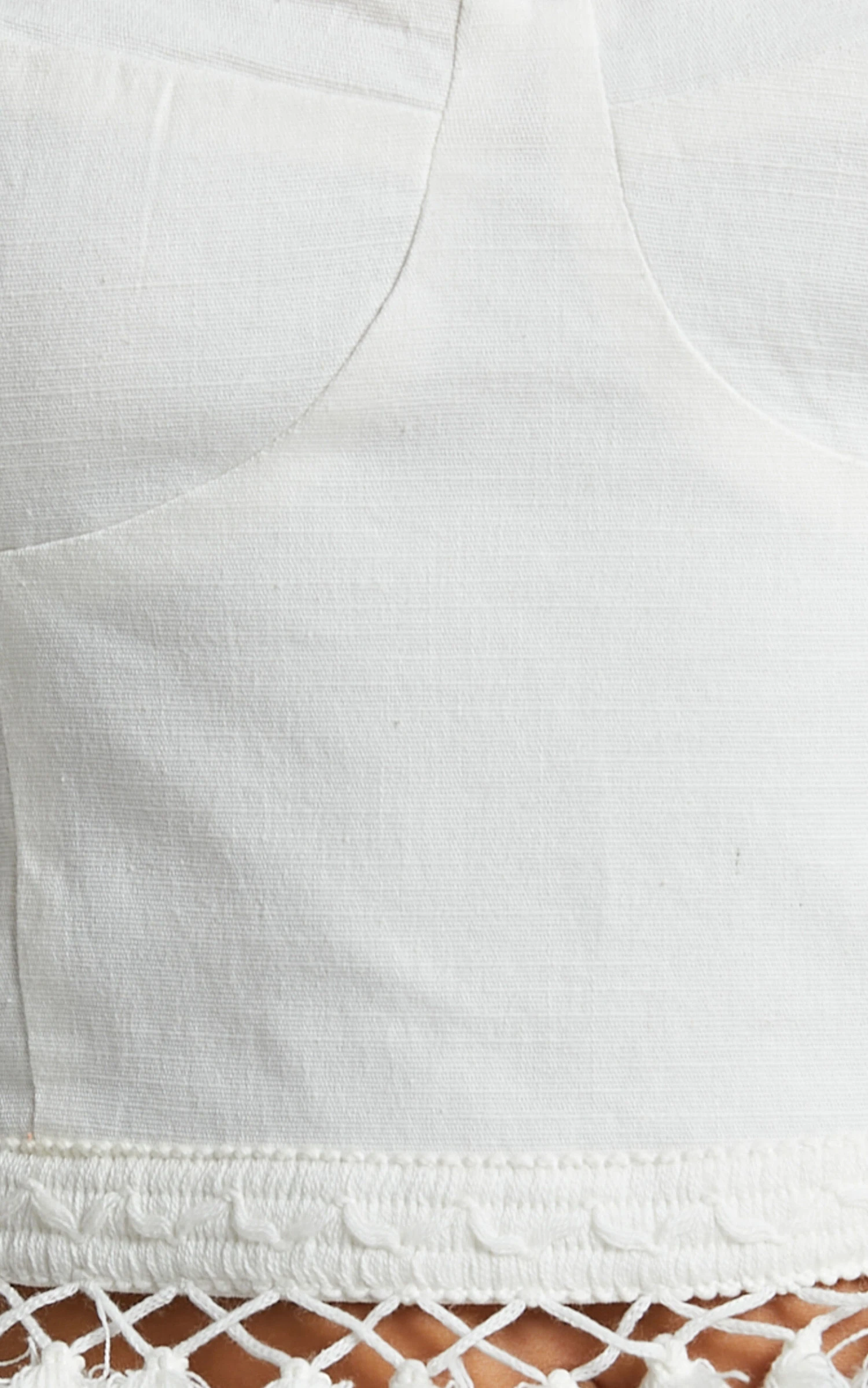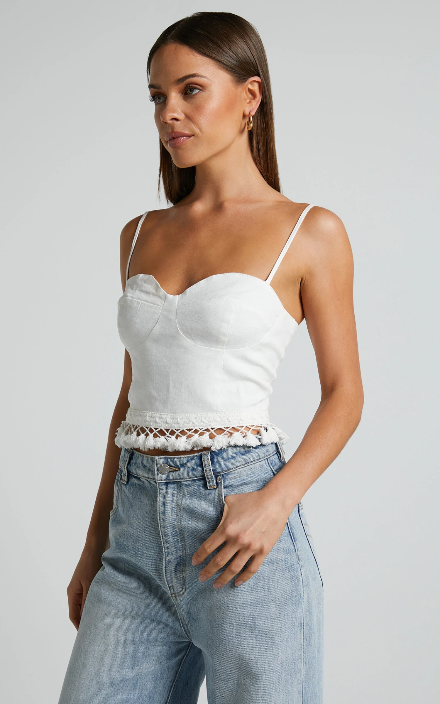 This Zehanie Bustier Tassel Trim Top is the perfect addition to your summer wardrobe! The sweet and playful tassel details add a touch of fun to this casual white top. With a sweetheart neckline and sleeveless design, it’s both cute and comfortable. And let’s not forget about the crop length – ideal for showing off your favorite high-waisted jeans or skirts.