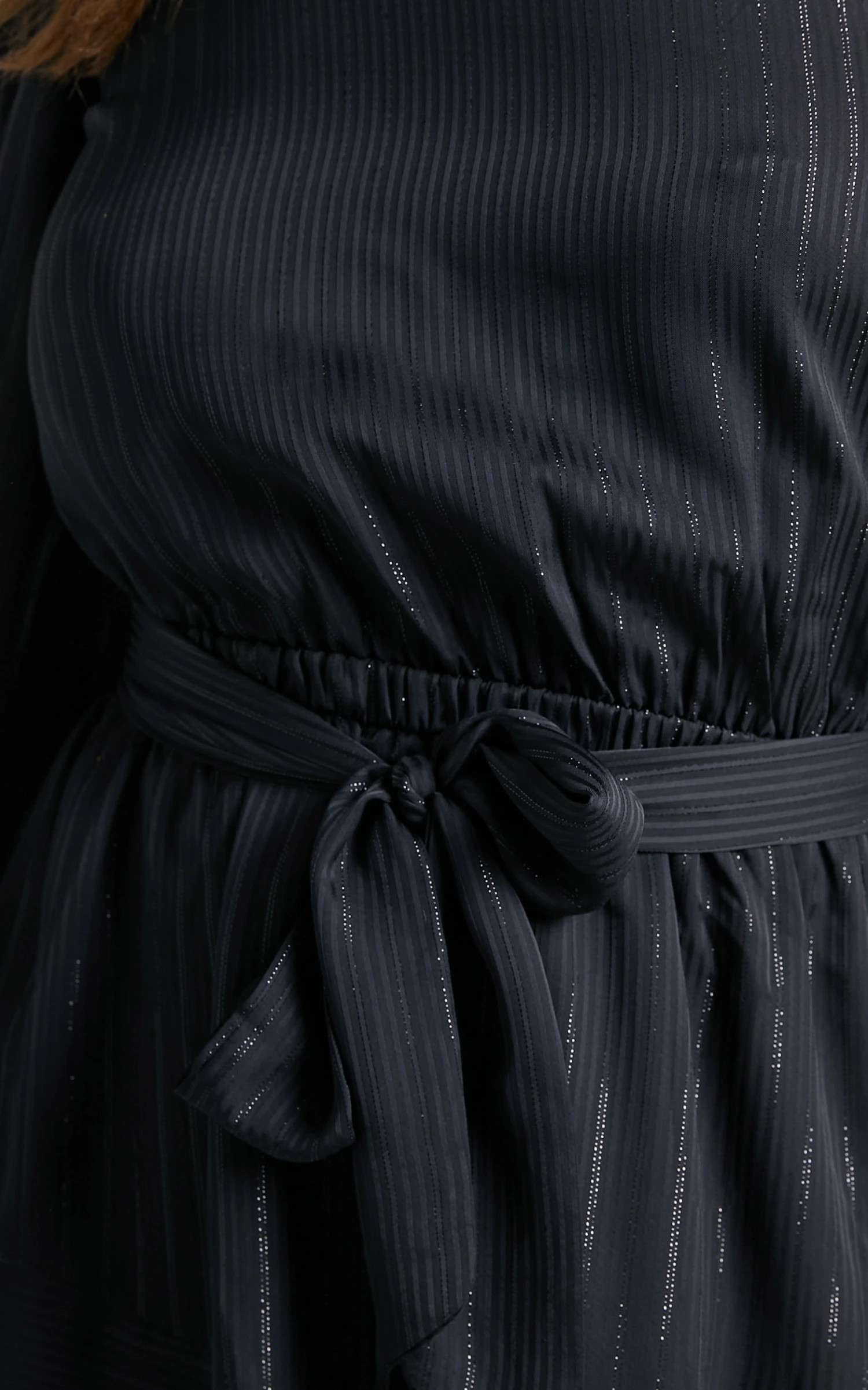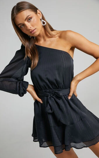 A little chic, a little glamorous – that’s our Zyra Dress! This gorgeous LBD features an asymmetric neckline with a one-shoulder design, long balloon sleeve, waist tie and a double tiered ruffle hem. The silver thread throughout the dress gives it that sparkle factor when it hits the light, so you’ll be ready to shine through the night! Wear this mini to a party with some strappy heels, statement earrings and a clutch for a look to remember!